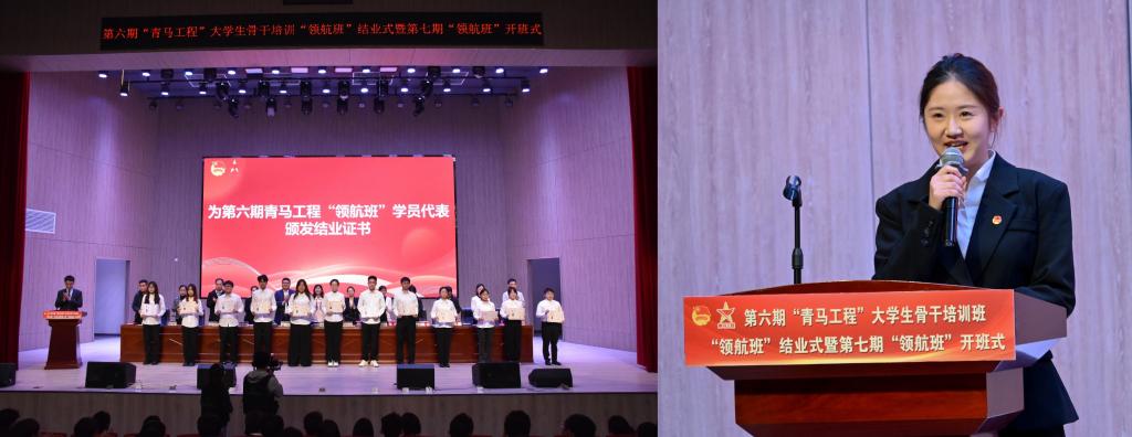 仪式上,杨玖庆从第六期学员的手中接过“领航班”的旗帜,郑重传递到第七期学员的手上。她表示,旗帜的传递标志着星火的传承,也吹响了第六期“领航班”学员再创新辉煌的冲锋号,奏响了第七期“领航班”学员踏上新征程的进行曲,她寄语第七期青马学员要初心如磐、笃行不怠,以信仰之光引领青春航向,以实际行动践行青春誓言。她勉励全体团学骨干在未来的学习生活中坚持学而信、学而思、学而行,坚定不移用习近平新时代中国特色社会主义思想统一思想、统一意志、统一行动,用党的科学理论武装头脑、指导实践,努力成为政治合格、信念坚定、行动有力的青年马克思主义者,奋力书写为中国式现代化挺膺担当的青春篇章。