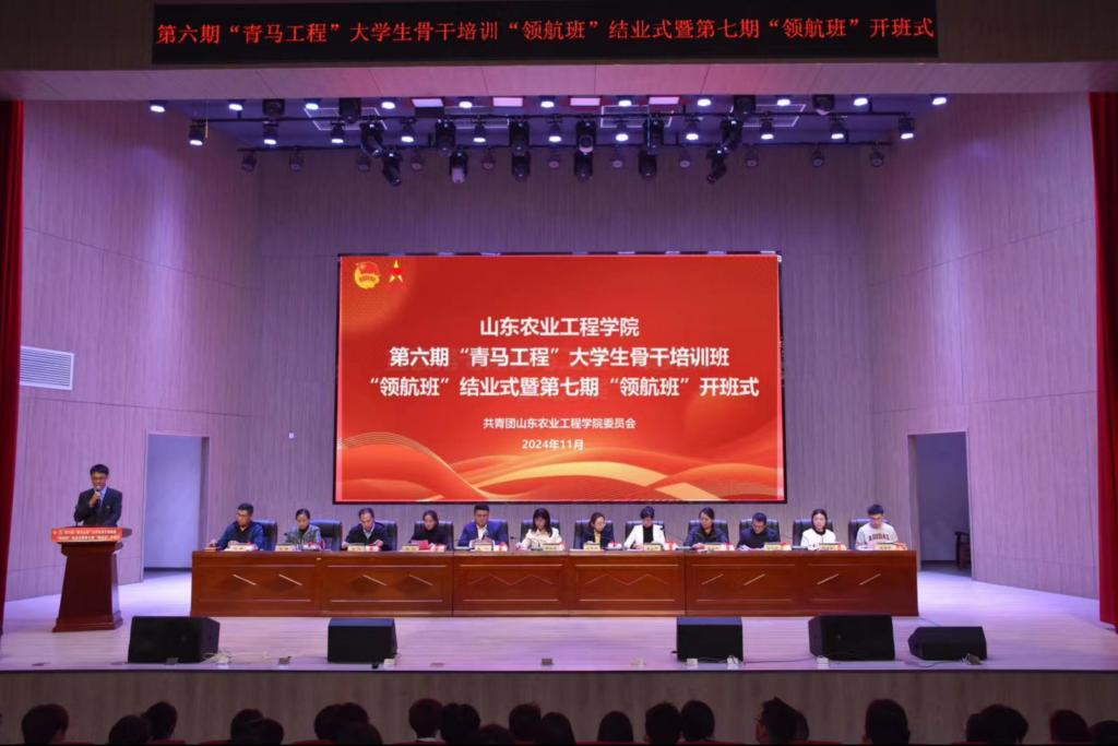 为深入学习宣传贯彻党的二十大和二十届二中、三中全会精神,加强对团员青年思想政治引领,着力为党培养和输送青年政治骨干,11月21日下午,第六期“青马工程”大学生骨干培训班“领航班”结业式暨第七期“领航班”开班式在淄博校区举行。校党委委员、副校长杨玖庆出席活动并讲话,校“青马工程”领导小组成员单位负责人,各学院党总支副书记、团总支负责人,第七期“领航班”临时团支部指导教师,第六期、第七期“领航班”全体学员,各学院团学骨干代表500余人参加活动。