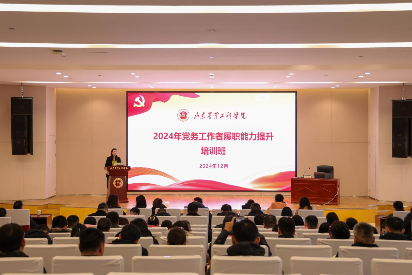 12月4日,2024年党务工作者履职能力提升培训班在淄博校区举办。校党委副书记张业赏同志出席开班式并讲话,党委组织部正处级组织员潘潇璇主持开班式。学校机关党务干部、各二级学院(部)党组织书记、副书记、委员、专职组织员百余人参加培训。