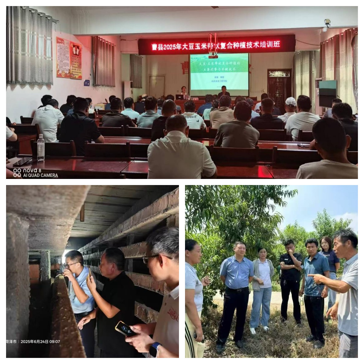 刘进、秦旭教授,分别就《桃产业发展与品质提升技术》和《大豆玉米复合种植技术管理》进行了专题授课,曹县果树规模种植户、大豆玉米复合种植村支书代表和种植户代表150余人参加。授课结束后,刘进教授到曹县曹城街道高复利农业产业园现场指导桃树管理技术。林业工程学院张大鹏副教授先后到曹县朱洪庙镇众人土元养殖专业合作社、苏集镇张士庄村,实地调研并指导土元养殖情况和“芦笋+金蝉”创新种养结合模式。各位教授专家的指导既有理论高度又具备实操性,赢得参训学员和当地种植养殖户的高度好评。