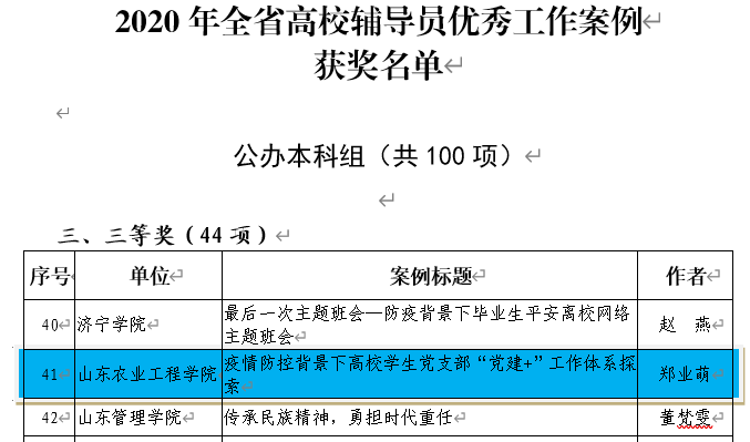 近日,由山东省委教育工委组织开展的全省高校辅导员2020年度优秀工作案例评选结果进行了公布,我校资源与环境工程学院党总支副书记郑业萌撰写的《疫情防控背景下高校学生党支部“党建+”工作体系探索》工作案例荣获了三等奖。
