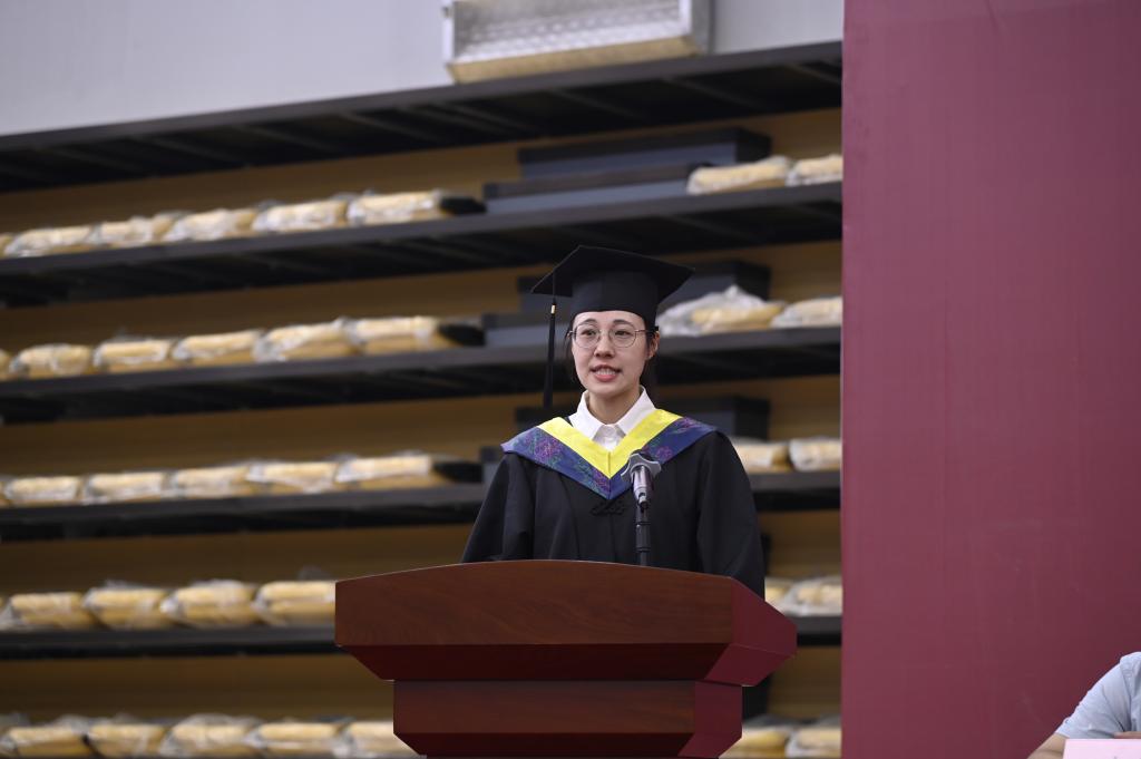 毕业生代表韩文九虎、刘慧泽、姜莹同学代表全体毕业生,表达了对学校辛勤栽培的感激并表示作为山工院人无论走在哪里都会深爱母校,不会忘记“厚德、自强、求是、笃行”的山工院校训,将小我融入国家、民族、乃至全人类的大我当中,以民族复兴的步伐为节拍,以永远奋进的青春为旋律,谱写新时代的命运交响曲,为学校增光添彩。