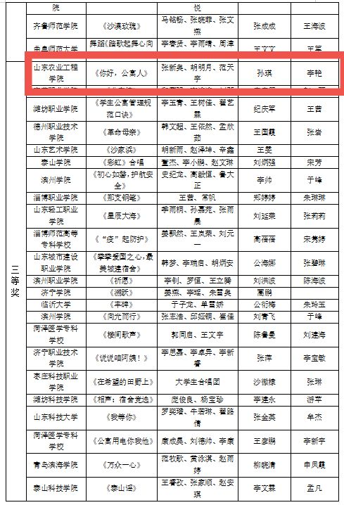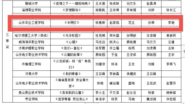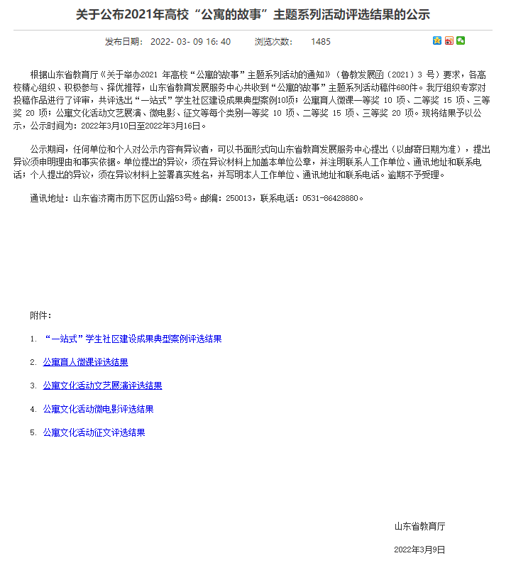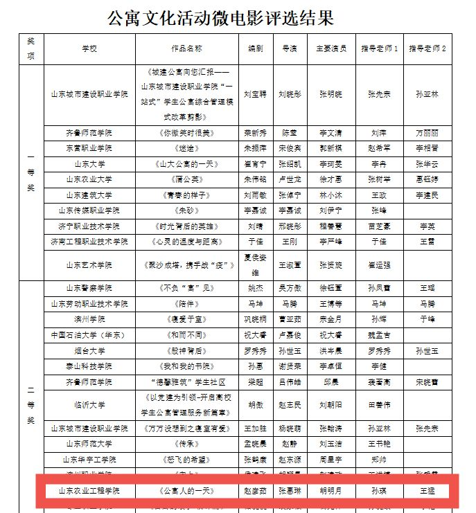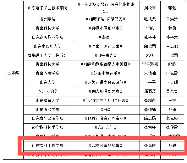 近日,山东省教育厅公布的《关于公布2021年高校“公寓的故事”主题系列活动评选结果的公示》中,我校师生表现突出,在多个项目中获奖。其中,孙琪老师、王猛老师获得二等奖,李艳等3位老师获得三等奖,赵彦茹等3名学生获得二等奖,张惠琳等6名学生获得三等奖。