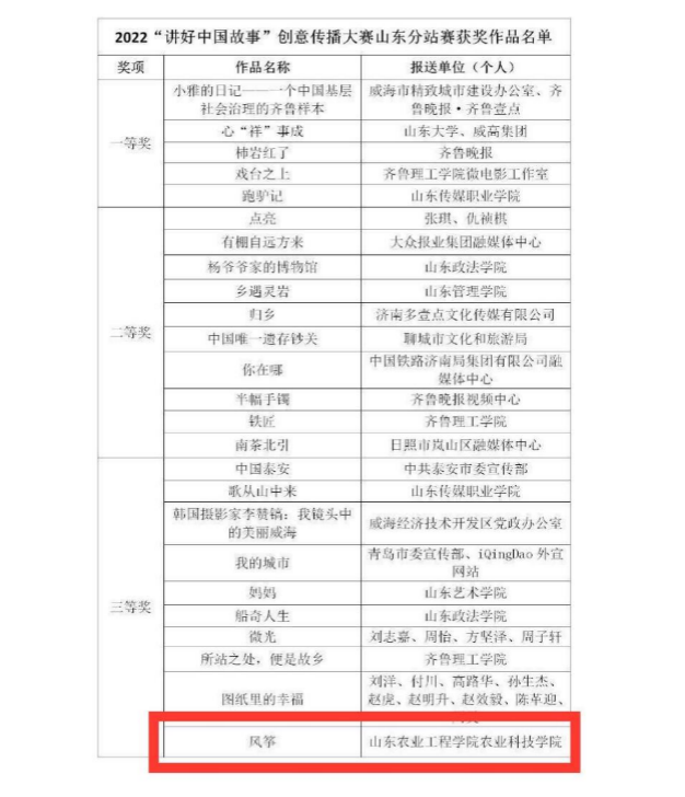 近日,由中国外文局、山东省人民政府新闻办公室指导,当代中国与世界研究院、中国互联网新闻中心、大众报业集团(大众日报社)主办,齐鲁晚报·齐鲁壹点、齐鲁理工学院承办的2022“讲好中国故事”创意传播大赛山东分站赛获奖作品名单正式出炉,我校农业科技学院作品《风筝》荣获三等奖。
