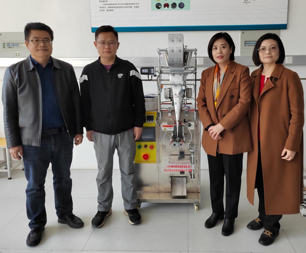 在食品加工实训中心,张亚栋耐心细致地对包装机的各项功能进行演示,于克学就其加工原理、功能拓展和市场需求进行了研讨。赵志桓及相关教师围绕食品包装行业的发展趋势、食品机械的研发设计、跨学科应用型创新人才培养等方面展开深入交流。