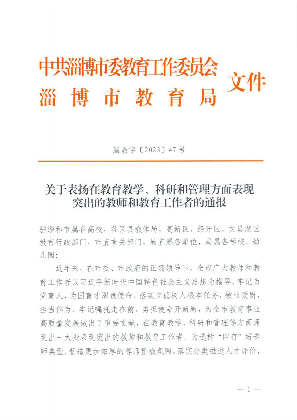 近日,中共淄博市委教育工委和淄博市教育局对我校淄博校区8位教师和2位教育工作者进行了表彰。于洋、姜明明、孙向群、丁有强、张立、张桂斋、陈岱莲、谢萍被评为淄博市选树表扬的教师,刘书兵,陆昊被评为淄博市选树表扬的教育工作者。