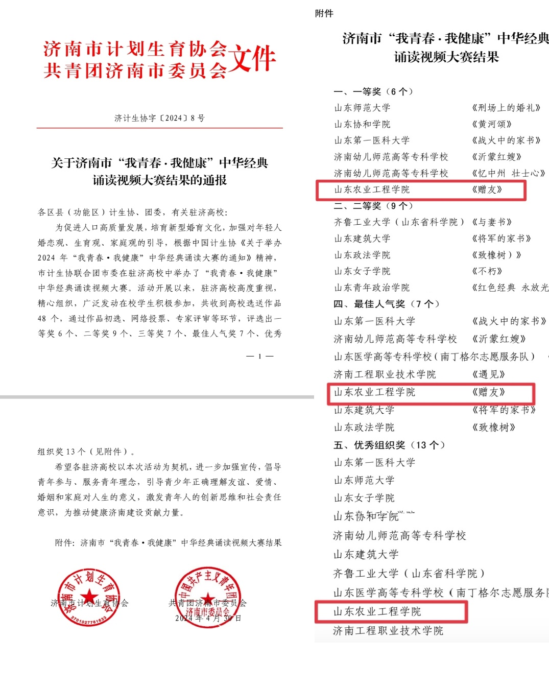 近日,由济南市计生协联合共青团济南市委举办的“我青春·我健康”中华经典诵读视频大赛圆满落幕,经过作品初选、网络投票、专家评审等环节,经济管理学院选送的作品《赠友》获得一等奖和最佳人气奖,学校荣获“优秀组织奖”。