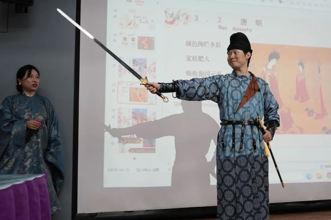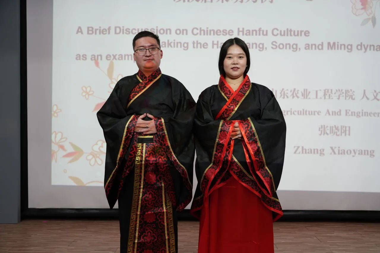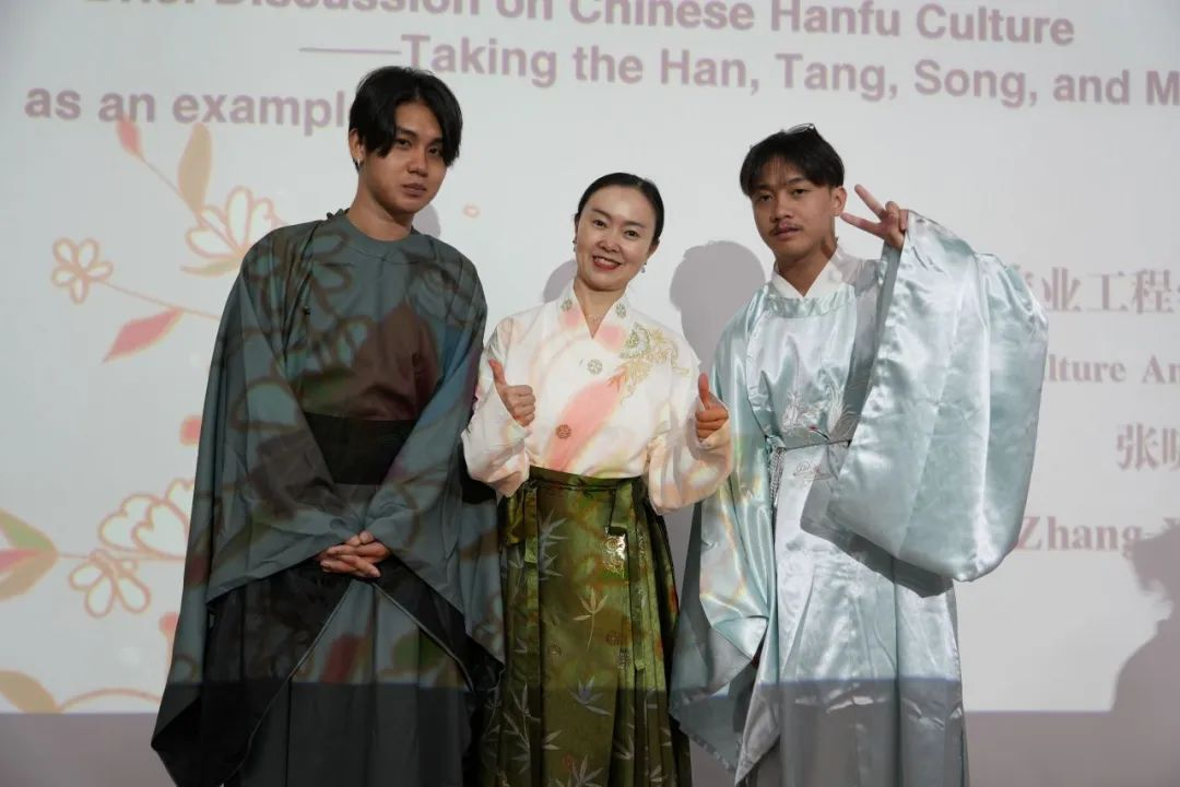 首先,我校人文学院教师张晓阳副教授以《浅谈中国汉服文化——以汉唐宋明为例》为题作了主旨报告。生动有趣、娓娓道来的讲解,带领大家穿越华夏时空,了解汉、唐、宋、明四个朝代的汉服演变历程和特色服饰风格。她将汉唐的雍容华贵与宋明的清雅素净一一展现,和观众共同品味汉服的传统之美、文化之韵。为直观地展示中华传统服饰之美,她现场邀请多位师生身着精美的复原汉服,让在场观众近距离感受欣赏汉服的独特魅力。报告之后,张晓阳老师与泰国师生就汉服文化展开深入交流,并指导泰国师生现场试穿汉服,体验汉服之美。活动结束后,参与者纷纷拍照留念,意犹未尽。