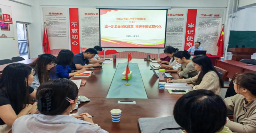 随后,段长元同志为党员宣讲党的二十届三中全会精神。在宣讲过程中,段长元强调要坚持理论与实践相结合,鼓励师生党员将学习成果转化为实际行动。教师党员要在教学中及时融入党的二十届三中全会精神,同时在学习和工作中积极践行,形成“学思践悟”的良性循环。