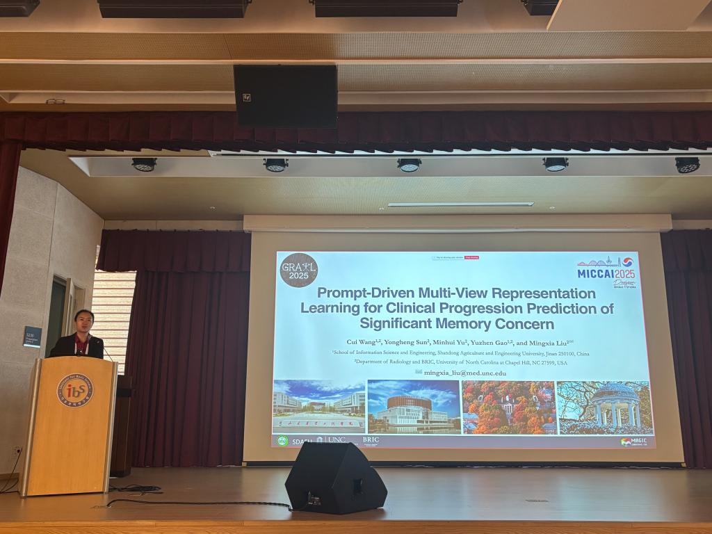 近日,信息科学与工程学院副教授王翠、高玉珍赴韩国大田(Daejeon)参加国际医学影像计算领域顶级会议 MICCAI 2025(Medical Image Computing and Computer-Assisted Intervention),并在专题研讨会GRAIL(GRaphs in biomedicAl Image anaLysis)上作学术报告。王翠副教授以《Prompt-Driven Multi-View Representation Learning for Clinical Progression Prediction of Significant Memory Concern》为题进行学术交流,提出一种基于提示学习(Prompt Learning)的多视角表征模型,针对阿尔茨海默病(Alzheimer’s Disease, AD)早期诊断中MRI影像跨域差异的问题,设计了多视角特征融合与自适应机制,在多源数据集上显著提升了分类精度与模型鲁棒性。高玉珍副教授以《Improving Late-Life Depression Analysis with Collaborative Domain Adaptation: Learning from Heterogeneous Structural MRI》为题进行学术交流,研究创新性地引入协同领域自适应(Collaborative Domain Adaptation)框架,用于老年抑郁症结构MRI影像分析,有效提高了模型在异质数据条件下的泛化性能,为情绪障碍类疾病的智能诊断提供了新思路。会议期间,积极与国际专家学者进行深入交流,就无监督领域适应、多模态影像融合及人工智能临床转化等前沿问题展开研讨,进一步拓展了国际合作与科研视野。
