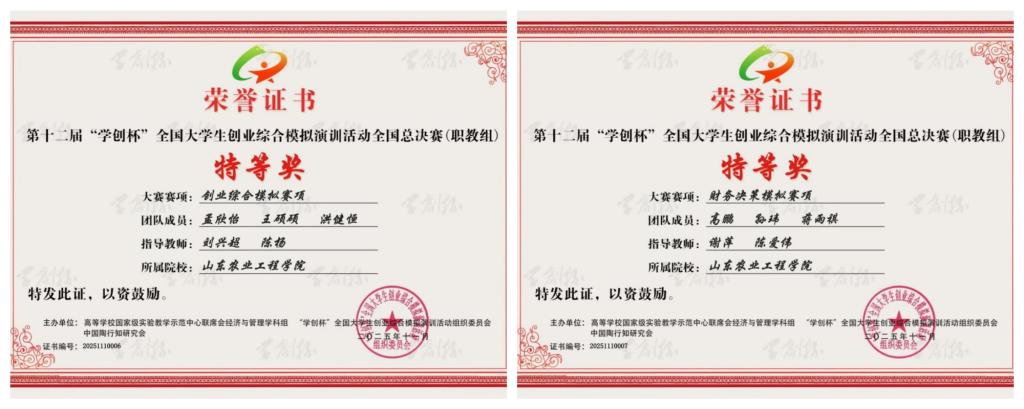 11月9日,第十二届“学创杯”全国大学生创业综合模拟演训活动全国总决赛(职教组)圆满收官,在这场吸引全国228所高职院校同台竞技的顶级赛事中,我校学子一路突围,以亮眼表现斩获双项特等奖——孟欣怡、王硕硕、洪健恒团队在“创业综合模拟赛项”中力压群雄,拿下全国第一名;高鹏、孙玮、蒋雨祺团队在“财务决策模拟赛项”中跻身全国第八名,创我校参赛以来历史最佳战绩。