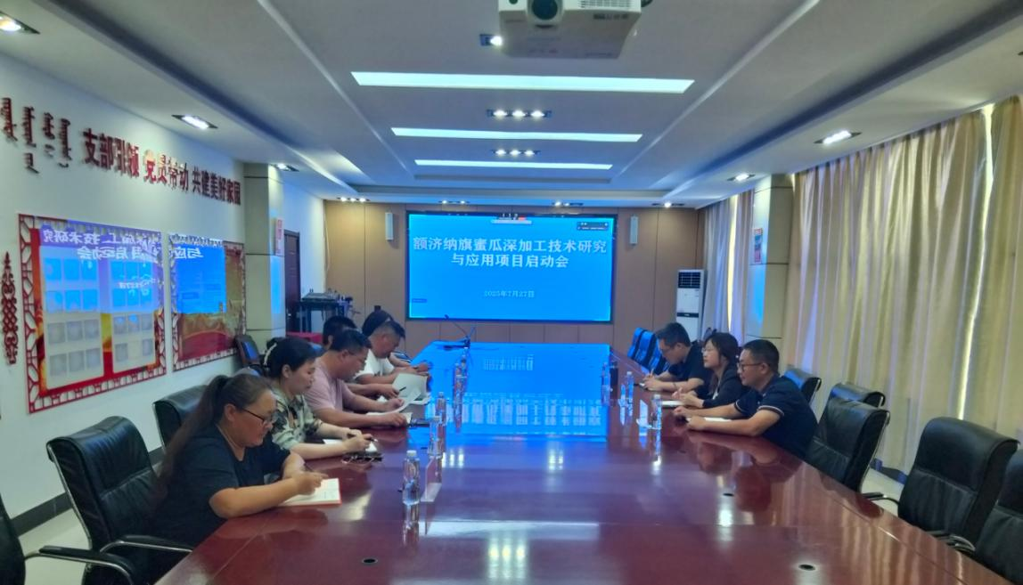 “额济纳旗蜜瓜精深加工技术研究与应用”项目深度融合额济纳旗独特的资源禀赋、企业的产业基础与我校的科研优势,重点突破蜜瓜精深加工及副产物循环利用关键技术瓶颈,致力于实现产业减损增效。项目启动会上,额济纳旗农牧和科技局技术推广中心张少明主任主持会议。迟晓君处长就《额济纳旗蜜瓜精深加工技术研究与应用》项目的整体规划、阶段任务与经费预算作详细汇报,项目各方围绕核心内容展开深入研讨。额济纳旗农牧和科技局刘勇书记强调该项目聚焦精深加工,赋能绿色产业,对提升当地农业现代化水平、促进产业升级与农民增收具有重大战略意义。