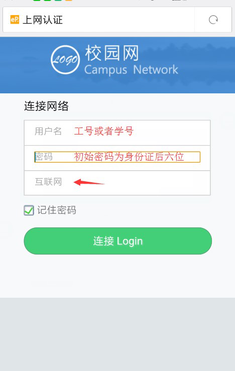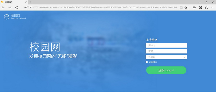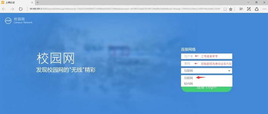 2、在弹出的校园网认证界面中输入您的用户名(学号)和密码,初始密码为您的身份证后六位,同时选择访问互联网或校内网,如下图: