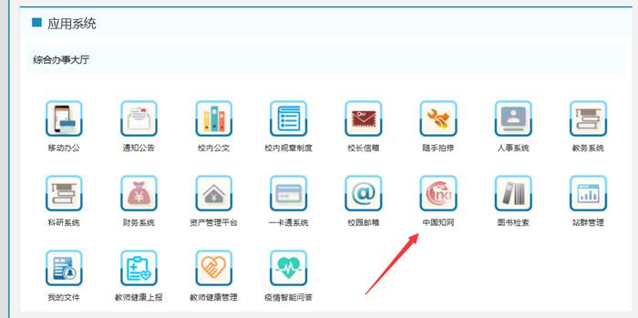 2.进入平台后,在应用系统—综合办事大厅,找到“中国知网”图标,点击进入即可。