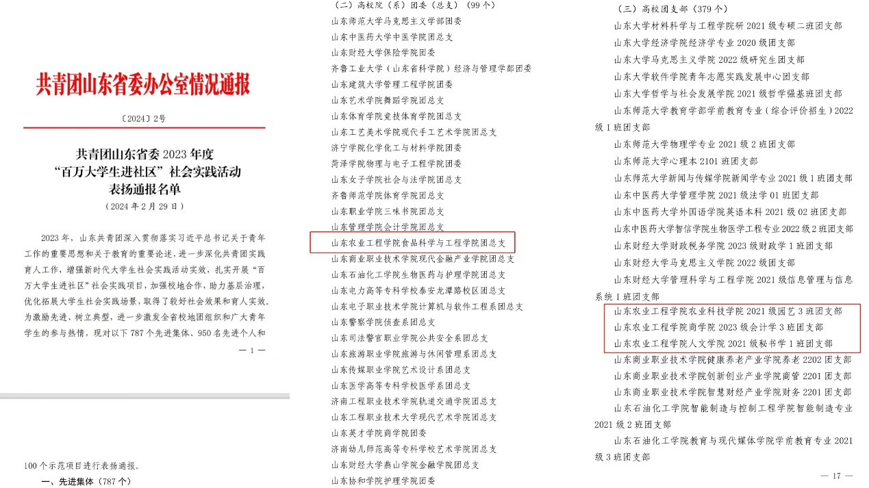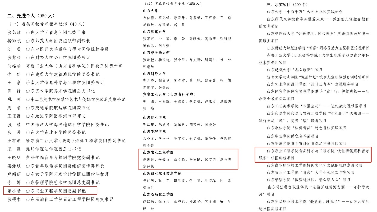 近日,共青团山东省委公布《2023年度“百万大学生进社区”社会实践活动表扬通报名单》,我校食品科学与工程学院团总支、农业科技学院2021级园艺3班团支部、商学院2023级会计学3班团支部、人文学院2021级秘书学1班团支部获评先进集体荣誉称号,食品科学与工程学院“慢性病健康科普与服务”社区实践项目荣获示范项目称号,指导教师董小靖,学生高姗姗、安俊百、尚春晓、张雨晴、宋立国、周程志、高佳怡获评先进个人荣誉称号。