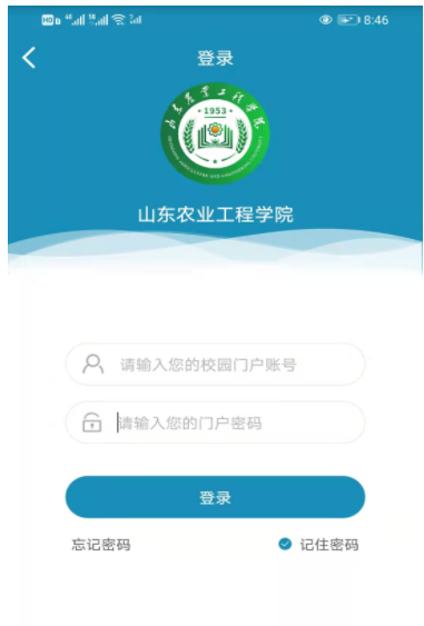 步骤一:微信扫描下侧二维码下载并安装智慧山工院APP,打开APP后在如下界面,输入校园门户账号(教职工为工号,学生为学号)及密码(密码为身份证后六位)登录。