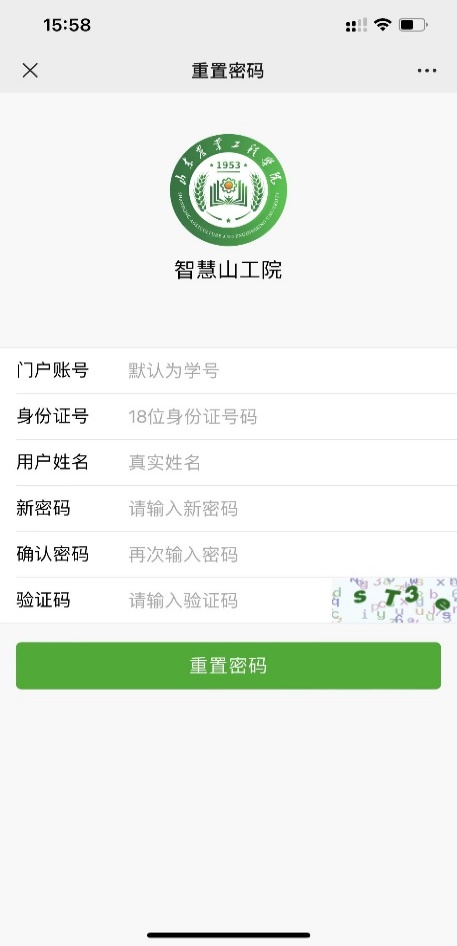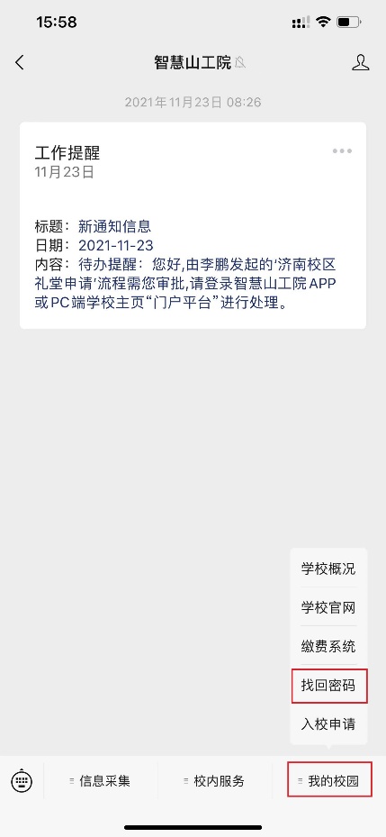 1、关注“智慧山工院”并打开; 2、点击“我的校园”“找回密码” 3、填写真实信息重置密码
