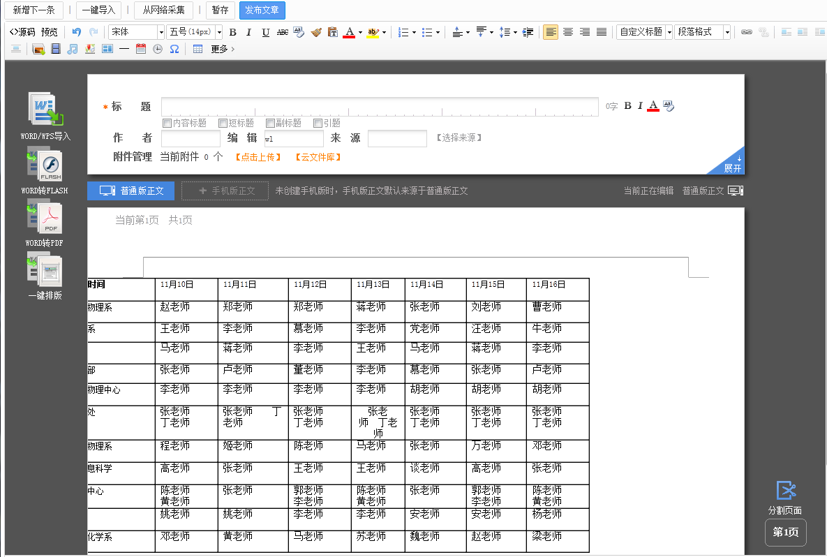 将纸张方向设置为横向的WORD文件导入编辑器,就会出现信息超出边界,不能将文档信息全部显示。若将此文章发布,还极有可能造成内容页面被撑开,导致内容页变形的情况。