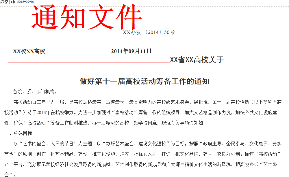 公告、通告、通知类的文件是一种正式、严肃的公文,在编写此类文件时一定要严格按照它规定的格式进行排版,在将这类文件导入编辑器时,建议使用WORD转FLASH功能,此功能可以使HTML页面上的显示效果和WORD文件中的效果一模一样,使文件高度保真,不建议使用WORD导入功能。