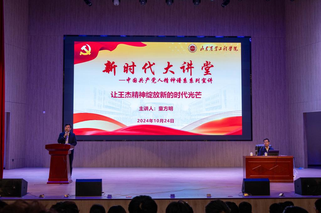 为全面贯彻落实党的二十届三中全会精神,教育引导师生在感悟中国共产党人精神谱系、体悟中华人民共和国成立75周年光辉历程中传承红色基因、赓续红色血脉,10月24日下午,由党委宣传部主办,学生工作部、马克思主义学院承办的中国共产党人精神谱系系列宣讲之王杰精神专题讲座在淄博校区大学生活动中心举办。本次讲座邀请原济宁羊山景区党工委书记、管委会主任、王杰纪念馆馆长童方明担任主讲嘉宾,各二级学院教师代表和学生骨干500余人参加。讲座由马克思主义学院党总支书记、院长周安忠主持。