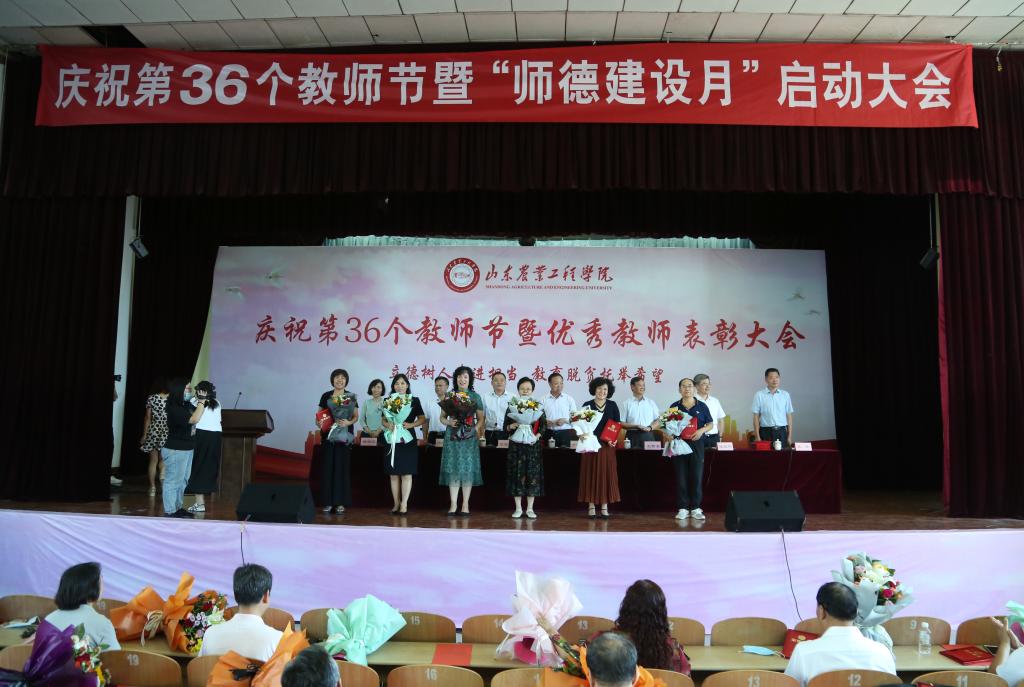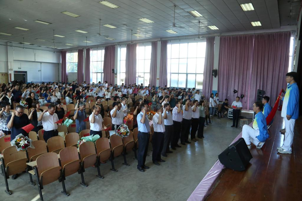 张业赏宣读了学校从教三十年及以上在职教师人选名单和校党委关于“最美教师、师德标兵、优秀教师、优秀教育工作者”表彰决定,全体校领导班子成员为受表彰的个人颁奖。随后,全体与会教师面向国旗,举起右拳,进行了庄严的教师宣誓。