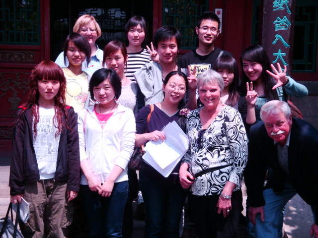 图2:带领学生在趵突泉公园进行《导游英语》课程的实践教学,为偶遇的外国游客进行英文讲解并合影留念