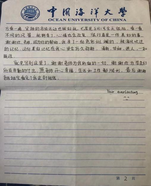 08级张同学获得全国大学生英语竞赛特等奖,有机会去青岛参加夏令营。在她因家境困难欲放弃这一来之不易的机会时,我主动为其支付了2000余元的营费和相关生活费,让她在夏令营中得以更好地进步和成长。后来这个腼腆的女孩子给我写了这样一封信:“关于夏令营,这是我从初中开始就梦想的一件事,谢谢您帮我圆了这个梦想。……谢谢你,老师,因为你的帮助,我多了一份色彩斑斓的、被海风吹过的记忆,这份美好记忆在我心里会历久弥新,清新、甘甜、迷人,一如既往。”