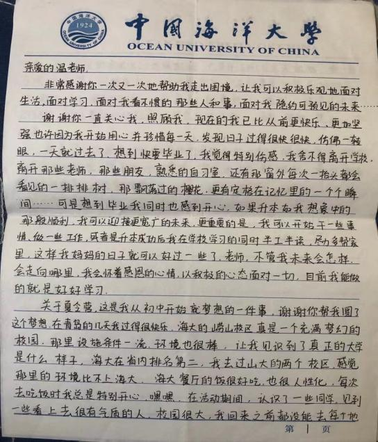 2001级董同学是职业高中毕业后考入我校的专科学生。因学习基础较差,他入校后比较散漫,缺乏学习热情。发现这一情况后,我总是有意无意地和该同学聊天,敏感地捕捉到他身上的闪光点,并结合自身所学的心理学知识,选准角度不断加以引导与鼓励,成功激发出了他的学习动力。后来,董同学在学习信心的加持下,学业上一路高歌猛进,先后考取山东师范大学硕士研究生和西南民族大学博士研究生。现在的董同学也是一名高校教师,成为了我的同行。他在给我的信中这样写道,“我的成长之路,一直都有您的陪伴与支持,是您给了我对学习的信心。一个学生对自己母校的感情,绝不会来自一棵苍翠的古树,而是来自一群人。从学校毕业几年了,每次回到熟悉的校园都会有一种游子回乡的亲切感。当我越过波澜壮阔的江河,从彼岸回望此岸的时候,我不会忘记那个为我摆渡的人—我的温老师。”每每想到他们,我的心中就会一片温暖。
